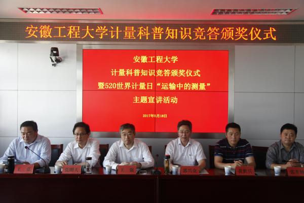 5月17日上午10:00,校首届计量科普知识竞答颁奖仪式暨520世界计量日“运输中的测量”主题宣讲活动在A座行政楼1121会议室如期举行。副校长郭兴众、省质监局计量处处长王强、芜湖市质监局副局长黄世兵、校学生处处长张开炳、监察处副处长章兵、总务处(基建办)副处长胡章文等出席活动。学校办公室主任王弘主持会议。经过角逐,21名获奖学生获奖,电气学院、生化学院、计算机学院三个学院获得优秀组织奖。