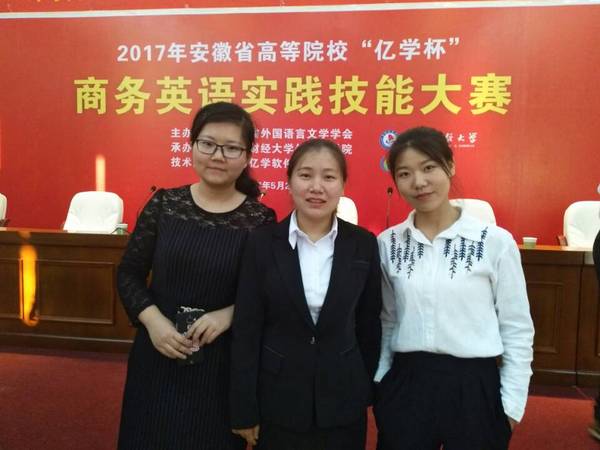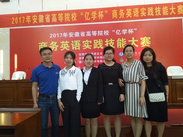5月27日,首届安徽省高等院校“亿学杯”商务英语实践大赛在安徽财经大学龙湖东校区圆满落幕。经过各高校初赛选拔,共有来自安徽财经大学、安庆师范大学、淮北师范大学等12所开设商务英语专业或方向的本科院校代表队参加角逐。由外国语学院2014级英语专业学生刁倩男、赵静静、桂巾杰组成的我校代表队荣获大赛三等奖。黄邵娟老师和项菁老师获优秀指导教师奖,英语系主任李新国老师带队参加比赛。