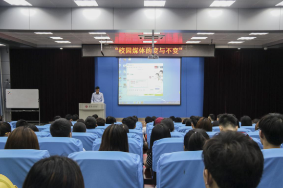 6月12日晚,校党委宣传部邀请我校社工2017届应届毕业生丁汪敏在5教117教室作题为《校园媒体的变与不变》的主题报告。校党委宣传部部长孙浩然出席本次活动,校大学生记者站、双微网络文化工作室及校广播台全体人员共同聆听了本次讲座。