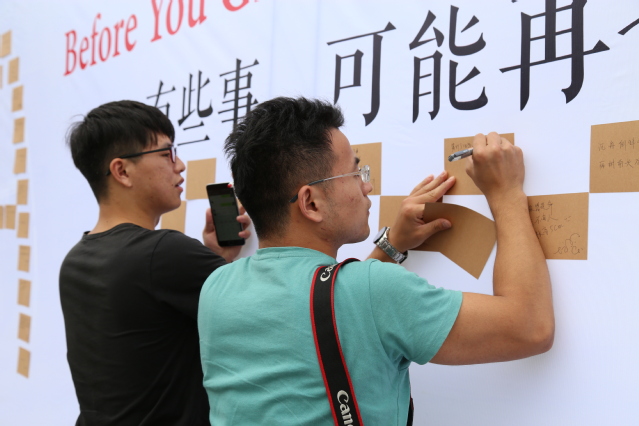 启动仪式结束以后,参加活动的毕业生与非毕业生代表在6教天桥上设置的毕业留言墙上留言寄语。