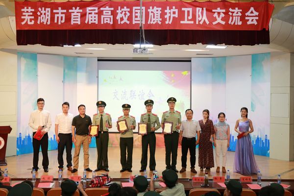 下午2:30,芜湖市首届高校国旗班展示交流活动颁奖以及文化联谊活动在学术报告厅进行。活动开始前宣布了芜湖市第二届高校国旗班展示交流活动承办单位为皖南医学院。与会教师分别为队列展示、视频制作、主题征文活动获奖代表颁奖。接着,四所高校国旗班成员紧紧围绕国旗班生活为主线,依次献上集体合唱、舞蹈表演、相声小品、诗歌朗诵等精彩的节目,皖南医学院国旗班选送的小品《军训那些事》、安徽师范大学皖江学院选送的武术表演《神坊羽衣刃》、安徽信息工程学院选送的朗诵《成长》、安徽工程大学选送的集体合唱《军歌飞扬》等获得热烈掌声。