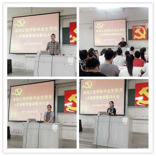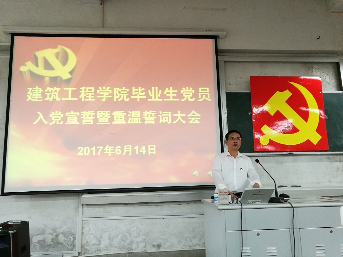 6月14日上午,建筑工程学院2017届毕业生党员入党宣誓暨重温誓词大会在2教107教室召开。学院党委书记徐达奇、团委书记刘海涛、各学生党支部书记和全体毕业生党员参加大会。大会由学院党委副书记李烨主持。