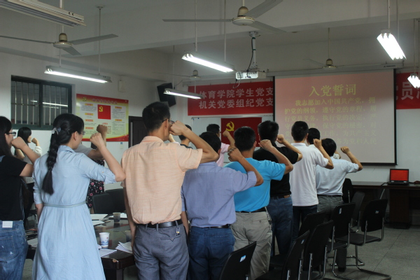 活动开始,全体党员在体育学院党总支书记文才新的带领下,面向党旗、庄严宣誓;毕业生党员深情回顾了挥洒青春、求学追梦的校园生活,简要汇报了各自在大学期间的收获和体会,纷纷表达了对组织、母校、老师和同学的感激之情,并作出了“不忘初心、牢记嘱托、做弘扬社会主义核心价值观的表率”的承诺。