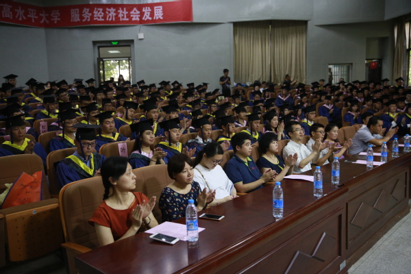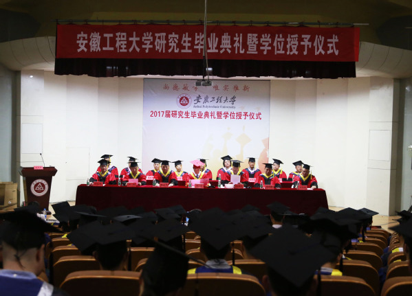 毕业典礼在庄严的国歌声中拉开帷幕。叶常林宣读学校授予2017届研究生硕士学位的决定。主席台前排就座的校领导和校学位评定委员会委员为获得硕士学位的毕业生颁发硕士学位证书并扶正流苏,获得硕士学位的同学依次上台接受学位证书。