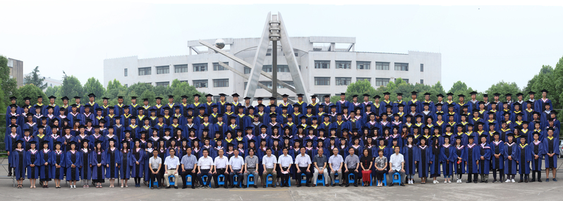 毕业典礼前,校领导、校学位评定委员会委员和全体2017届毕业研究生在校图书馆雕塑前进行了合影留念。