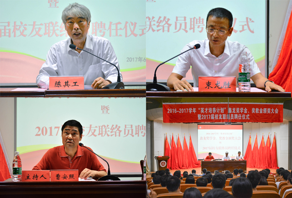 随后,主席台就坐领导、嘉宾以及基金会理事、监事为鑫龙奖学金、奖教金获奖者颁奖。主席台就坐领导、嘉宾,校友会负责人以及职能部门负责人为2017届校友联络员颁发聘书。