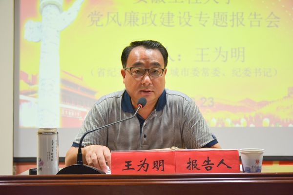 6月23日下午,省纪委委员、宣城市委常委、市纪委书记王为明应邀到我校作反腐倡廉专题辅导报告。报告会在学校学术报告厅举行,由校党委书记陈其工主持。王为明围绕“党建与发展的关系”、“党的十八大以来反腐败斗争形势和策略”、“腐败与权力”、“腐败案件的警示”等进行了阐述,系统回顾了改革开放以来反腐败斗争的发展历程,深入分析了腐败与反腐败的规律,详细介绍了当前反腐败斗争形势和策略,具体阐述了腐败的深层次概念和严重危害性,总结了腐败案件带来的警示和教训。