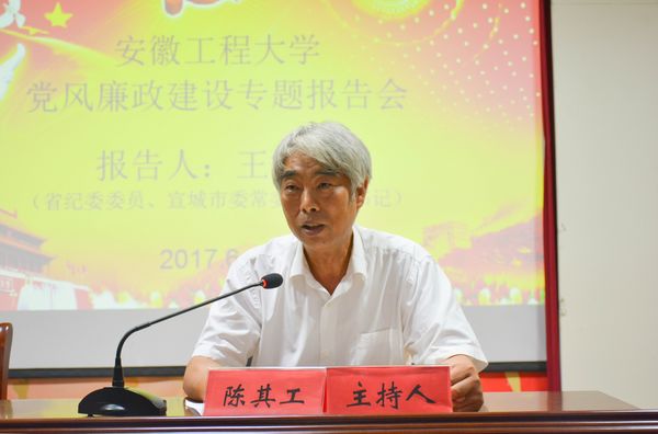 陈其工在报告会上指出,全校广大党员干部要认真学习王为明书记的报告精神,深刻认识当前党风廉政建设和反腐败斗争形势,深入贯彻《安徽省预防职务犯罪工作条例》,并以近年来查办的腐败案件为反面教材,从中吸取教训,自觉做到防微杜渐、自警自励;要切实加强“两学一做”,切实提高党性修养,坚定理想信念,牢固树立政治意识、大局意识、核心意识和看齐意识,严格遵守党的纪律和政治规矩,始终坚持心有所畏、言有所戒、行有所止,切实做到三严三实、清正廉洁;同时,要切实规范权力运行,自觉接受组织和群众的监督,不断推进党风廉政建设和反腐败工作深入开展,积极营造风清气正的政治生态和立德树人的育人环境,以良好精神状态和工作业绩迎接党的十九大胜利召开。