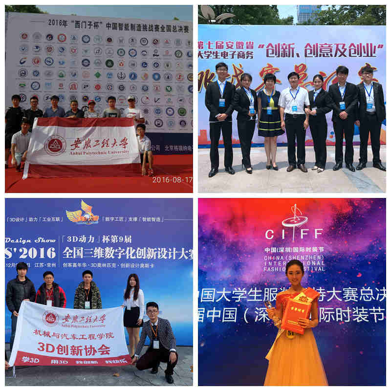 2017年,我校各项学科竞赛活动正在积极开展,各项大赛成绩也捷报频传,如在第五届全国大学生工程训练综合能力竞赛、第九届全国日语演讲比赛总决赛、第十一届全国大学生智能汽车竞赛(安徽赛区)、全国大学生工业设计大赛、第八届“红绿蓝杯”中国高校纺织品大赛、第九届“高教杯”全国大学生先进成图技术与产品信息建模创新大赛等竞赛中再创佳绩。