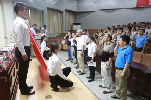 大会在激昂的《国歌》中拉开帷幕。在校党委副书记苏国红的带领下,全体党员重温入党誓词。大家佩戴党员徽章,面向党旗伫立,举起右手庄严宣誓。