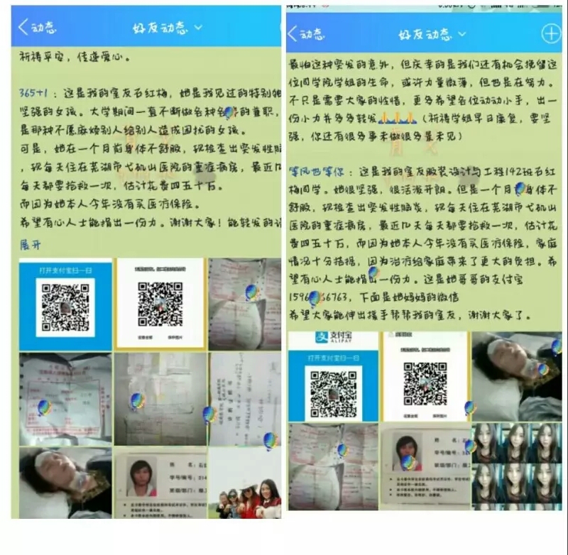 学校相关职能部门得知消息后,第一时间伸出了援助之手,校友基金会快速办理手续给予2000元的补助、学生处给予了2000元的困难学生资助,校团委也给予2000元的慰问金。学院领导高度关注学生病情,迅速组织班级、老师对石红梅同学进行募捐。班级里的同学更是心系梅梅病情,自发组织捐款行动,在学院团委的指导下迅速在线上线下同时进行。班级同学集众力将石红梅同学重病事件通过QQ、微信进行转发,希望得到身边同学的帮助,一夜之间,空间微信被刷屏,到处都是关于这个花季少女的消息,大家陆续献出自己的绵薄之力,慷慨解囊,捐款相助。纺织服装学院团委推文:生命接力-六月的安工程不该有阴霾,得到校团委的推送和宣传,广大师生纷纷献出爱心给予石红梅同学支持。同时班级同学也通过众筹平台帮助石红梅同学争取更多爱心人士的帮助。在学生处张开炳处长的指导下,班级连续三天在学校各食堂进行募捐,很多就餐的老师、学生纷纷奉献出自己的爱心。参与募捐的同学犹记得,食堂阿姨含着泪水从口袋里掏出自己微薄的收入放进募捐箱,还一边念叨着“姑娘一定会回来的!”。门卫叔叔也特意赶来食堂献出爱心,食堂经理也组织员工为石红梅同学筹集善款。众人拾柴火焰高,一方有难八方助,一时间爱心接力传遍校园,安工程洋溢着的是温情的气息。石红梅同学的事件不仅在同学中备受关注,自主创业的13级学生夏民权也利用自己创立的夏日春酿蜂蜜,为梅梅加油助力,做出每捐赠45元,会送出一份价值45元的蜂蜜,此爱心义卖也使得捐助走出校园,得到了广大爱心人士的支持。