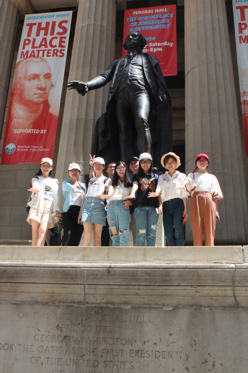 根据行程安排,同学们7月9日前往了纽约参观了联合国总部、华尔街、中央公园、世贸大厦遗址、自由女神像和移民馆等标志性建筑。