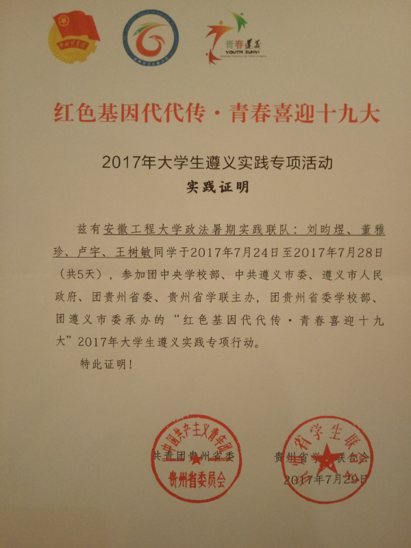 7月24至28日,由我校人文学院行政管理专业刘昀煜、董雅珍、王树敏、卢宇以及法学专业冯泽元等5位同学组成的社会实践团队,经校团委审核推荐,代表学校与来自全国98所高校100支实践团队成员共400余人参加由团中央学校部、中共遵义市委、遵义市政府、团贵州省委、贵州省学联共同主办的“红色基因代代传,青春喜迎十九大”2017年大学生遵义暑期实践专项行动,开启为期一周的红色文化体验之旅,接受来自革命老区的红色教育。