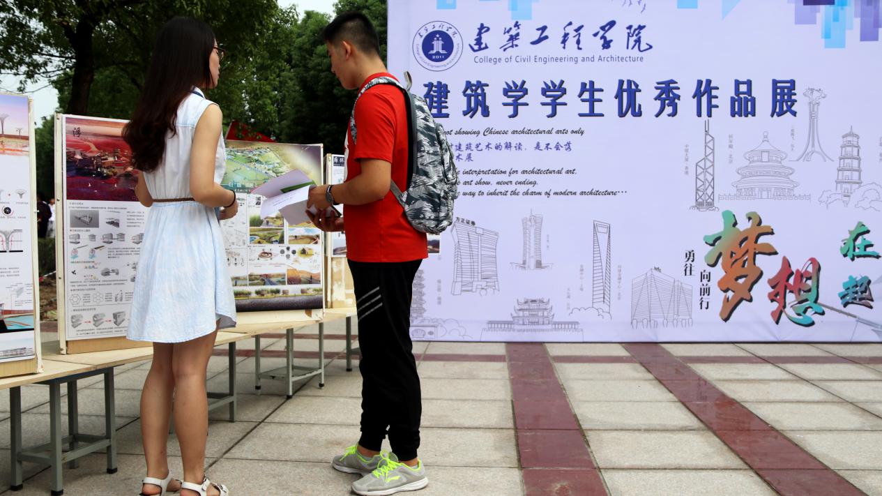 古典与现代的融合、新与旧的交错,建筑是艺术形式的一种完美呈现。建筑工程学院在迎新场地设置了展示历年优秀作品的展板,让新生对专业有了初步的了解。