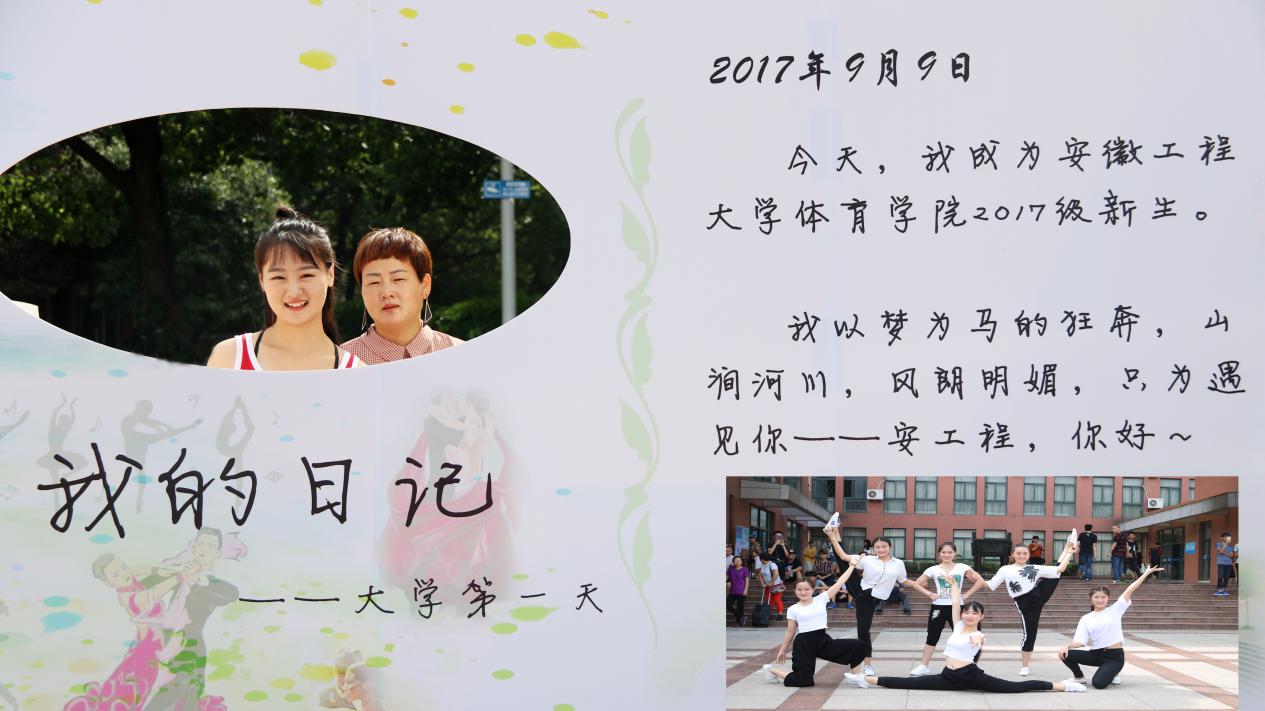 “以梦为马的狂奔,只为遇见明媚的安工程”,以日记的形式记录新生的“大学第一天”的活动,展现了体育学院独特的魅力。学长学姐们用精彩的舞蹈表演点亮了新生脸上灿烂的笑容。