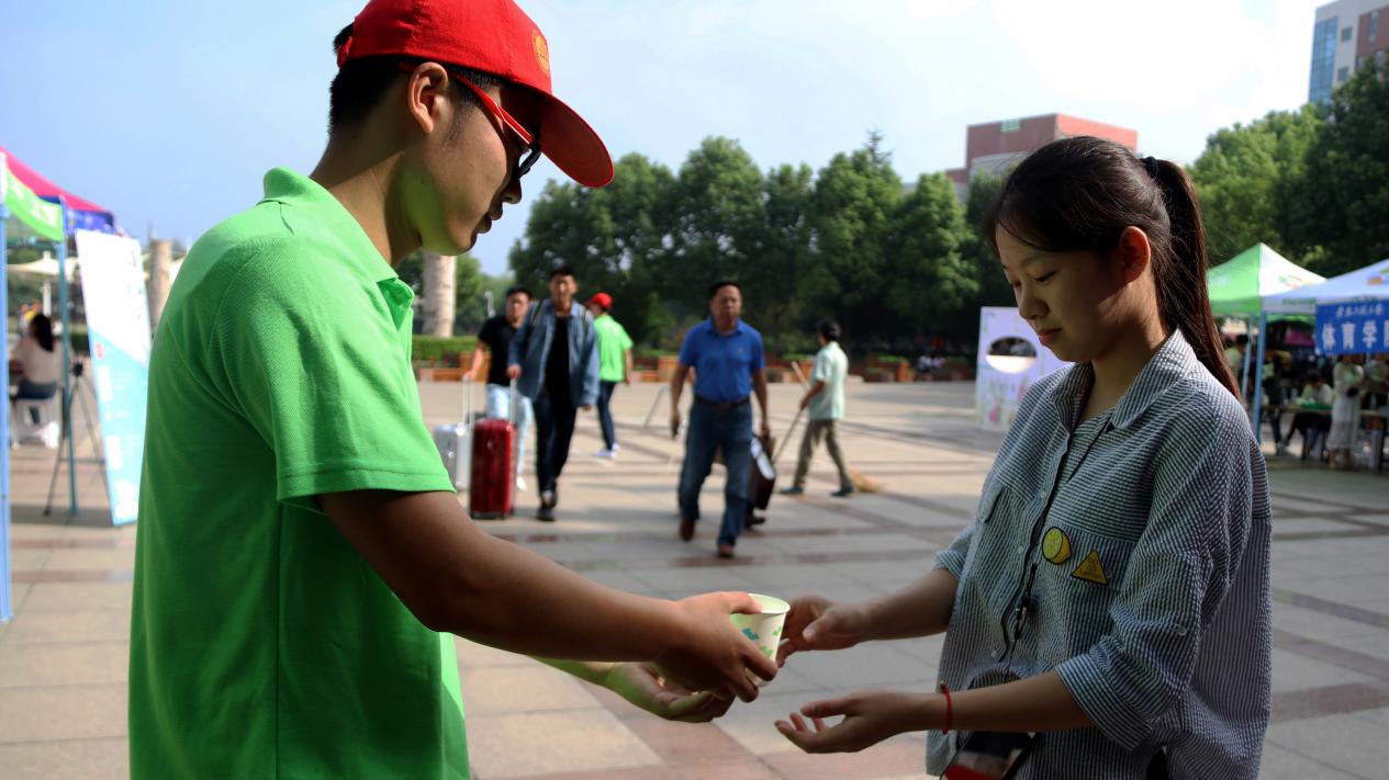 红帽子,绿T恤,生物与化学工程学院志愿者为新生送上自制酸奶,奉上满满的心意。学院立足专业特色,学以致用,体现了良好的专业实训成果。