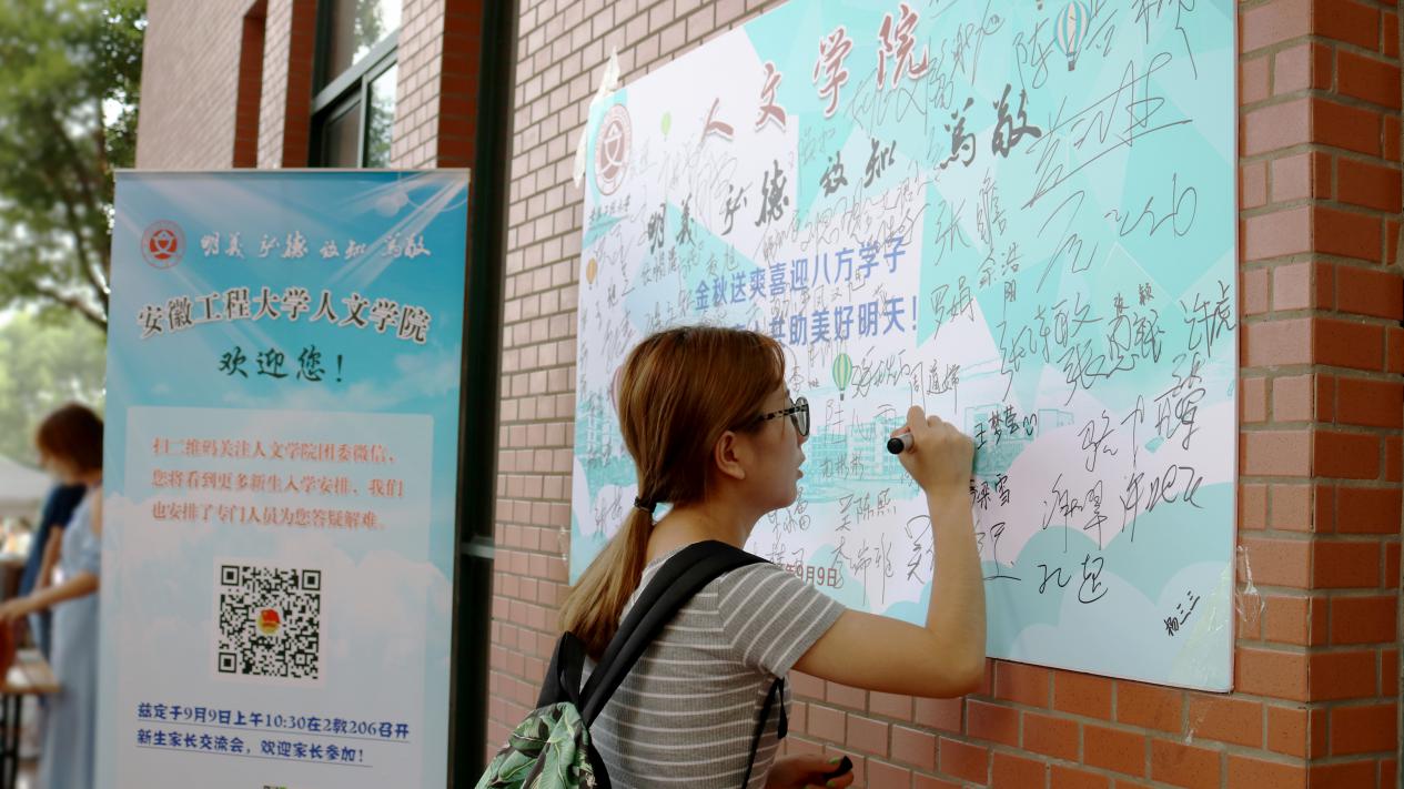 艺术学院精心制作特色展板,吸引新生与家人纷纷驻足并合影留念。学院还免费为新生提供具有艺术特色的校园地图,播放精美的动漫视频,让新生感受安徽工程大学的人文风貌。