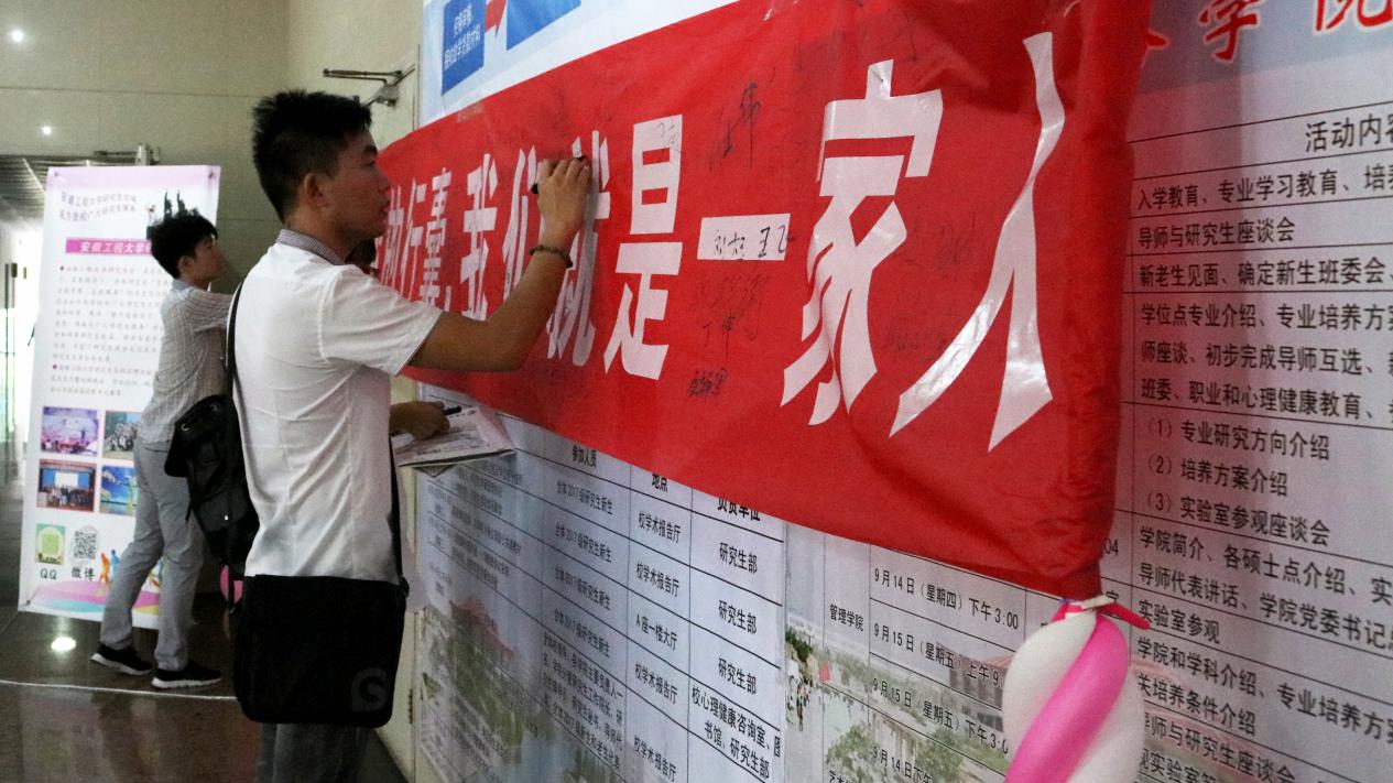 研究生部化繁为简,设立了醒目的红色条幅让前来报道的研究生们在上面写下自己的所思所想,字里行间透露着他们对未来的展望与期待。
