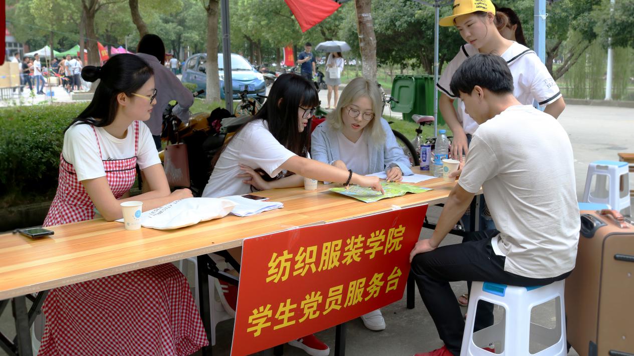 纺织服装学院的学生党员们在为广大新生提供服务的同时,耐心地向各位新生介绍入党知识和相关流程,引导他们积极向党组织靠拢。