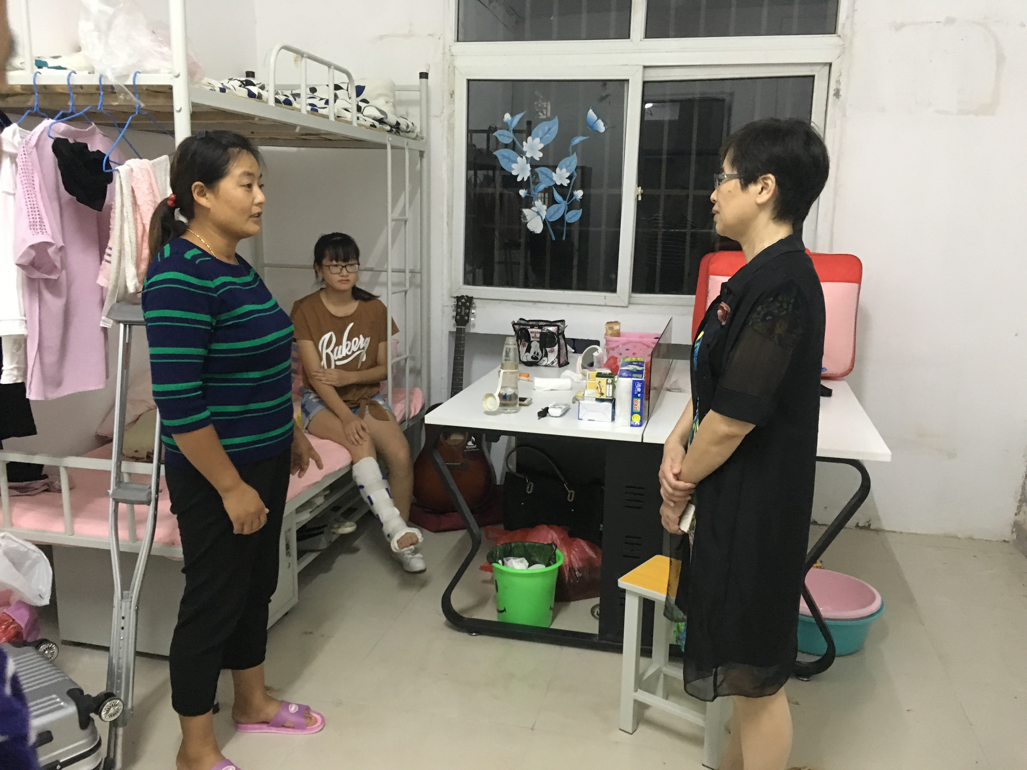 来自生化学院食品科学与工程专业172班的陶傲同学,入学之前由于意外腿部骨折,走路极度不便,家长和学生都有顾虑,担心生活上会出现困难,一度想过延期入学。学校得知这一情况后,立即为这位同学安排了临时宿舍,对学生具体的生活和学习都做了详细周到的安排,让学生安心入校读书。苏国红在走访时又特意来到了陶傲的临时宿舍,仔细询问陶傲来校之后的生活情况。陶傲同学表示,非常感谢学校对自己的特殊情况给予的照顾,自己十分向往大学生活,一定努力学习,在大学期间全面发展。陶傲母亲也表达了对学校的感谢之情。