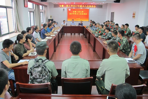 9月11日下午,学校2017年新兵入伍欢送会在行政楼1121会议室举行。学校党委常委、副校长郭兴众,校武装部部长陈其峰、学工部部长张开炳、武装部副部长江海、入伍新兵所在学院党委副书记及辅导员、3位退役复读老兵和入伍学生家长代表,共同为23名入伍新兵举办欢送会。陈其峰主持欢送会。