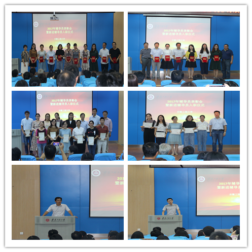 仪式前,学校对在省心理健康微课比赛、优秀辅导员评选、辅导员职业能力大赛、学生资助论文评选,和在学校青年教师教学竞赛、所带专业考研成绩突出的30名辅导员进行了表彰。苏国红和与会部门负责人分别为受表彰的辅导员颁发了荣誉证书,并合影留恋。