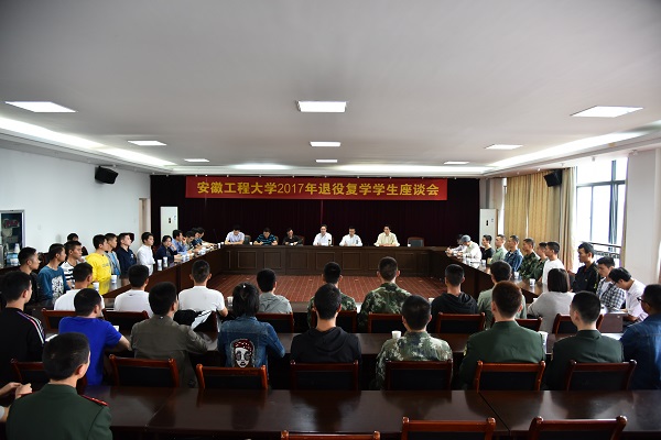 9月29日下午,学校在行政楼1314会议室召开2017年退役复学学生座谈会。校党委常委、副校长郭兴众,党委研究生工作部部长刘一、财务处副处长(主持工作)易华、教务处副处长凤权、学工部副部长胡家增、武装部副部长江海,相关学院党委副书记以及退役复学学生参加会议。座谈会由校武装部部长陈其峰主持。