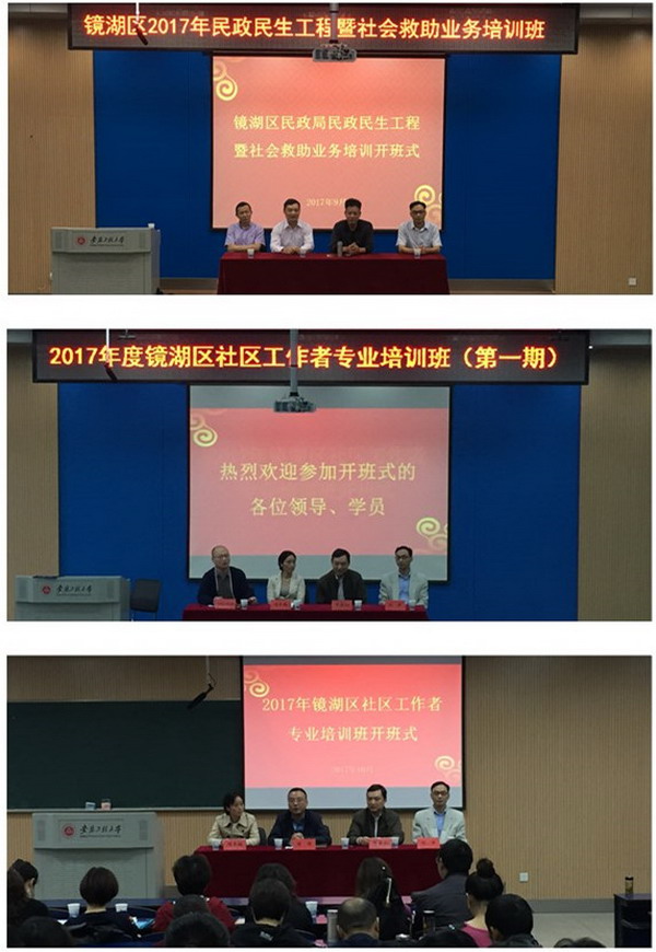 为充分发挥高校的社会服务功能,进一步深化校地合作,近期,我校人文学院联合芜湖市镜湖区民政局,共同举办了两批次共三个班的专业培训,参训学员均为来自镜湖区所辖各社区的社区工作者们。