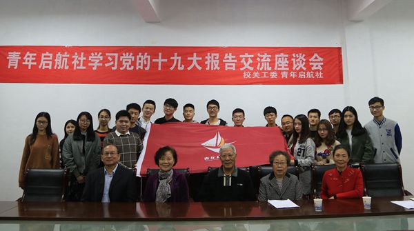 10月20日下午,青年启航社学习党的十九大报告师生交流座谈会在校团委会议室召开。校关工委常务副主任肖学东、委员寿达军,离退休教师代表余新霞、杨俊省、乔泽静以及校团委副书记郭广春、青年启航社18位同学参加了座谈会。