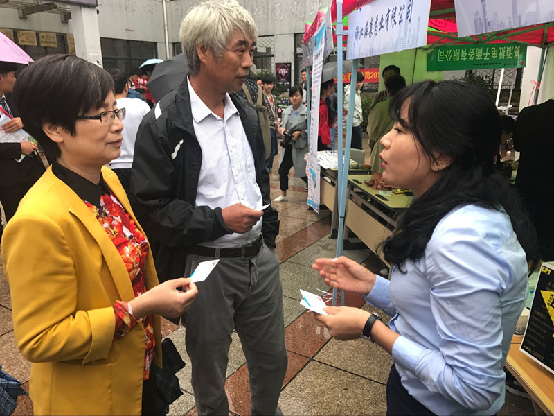 校党委书记陈其工、党委副书记苏国红在校大学生就业创业指导中心有关人员陪同下,来到招聘会现场。看到道明光学有限公司人事经理焦急的样子,陈其工说:“看来你们要做专场宣传,不然同学们不了解你们,实际上你们需求与我们的材料类专业、机械类专业很对口”。在浙江万里扬股份有限公司的展位前,陈其工一行停下脚步,与单位负责人交流企业产品、技术水准和人才需求情况,时而对身边的求职学生推介说:“万里扬是我国汽车零部件变速器行业领头企业,很不错,有条件的同学,可以积极投递简历”。关切地询问参会的日语专业学生,“投了几份简历啊?”“感觉怎么样?”