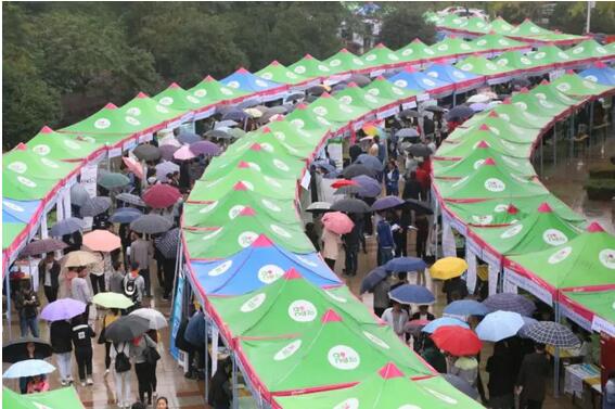 连日的绵绵秋雨,并没有影响用人单位和广大毕业生的热情,10月11日下午, 我校2018届毕业生首场组团招聘会在学校师生活动中心广场成功举办,绵延数百米的红顶帐篷下人头攒头,气氛热烈。浙江金华市人社局、智联招聘网共组织275家企业入校开展招聘活动。据统计,招聘会共提供岗位4000余个,参会及观摩的学生近5000人,近600名毕业生与用人单位现场达成就业意向。