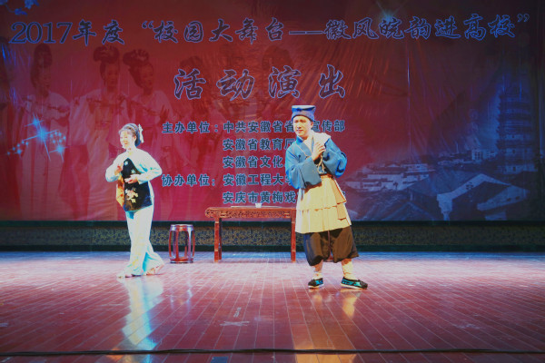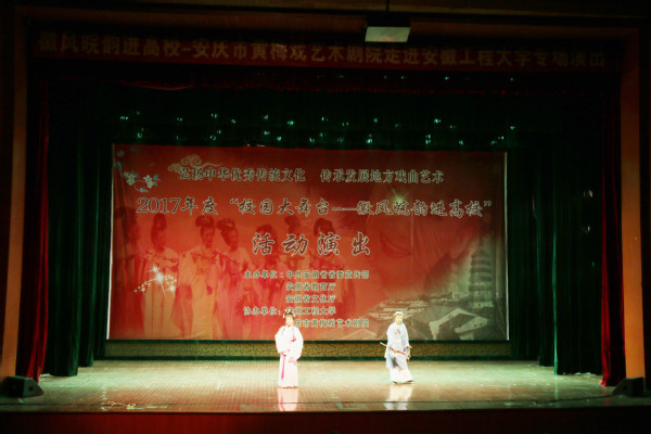 10月29日晚,2017年“校园大舞台—徽风皖韵进高校”安庆市黄梅戏艺术剧院走进安徽工程大学专场演出在我校师生活动中心精彩上演。校党委副书记苏国红、相关部门和学院负责人与1000多名师生共同观看了演出。