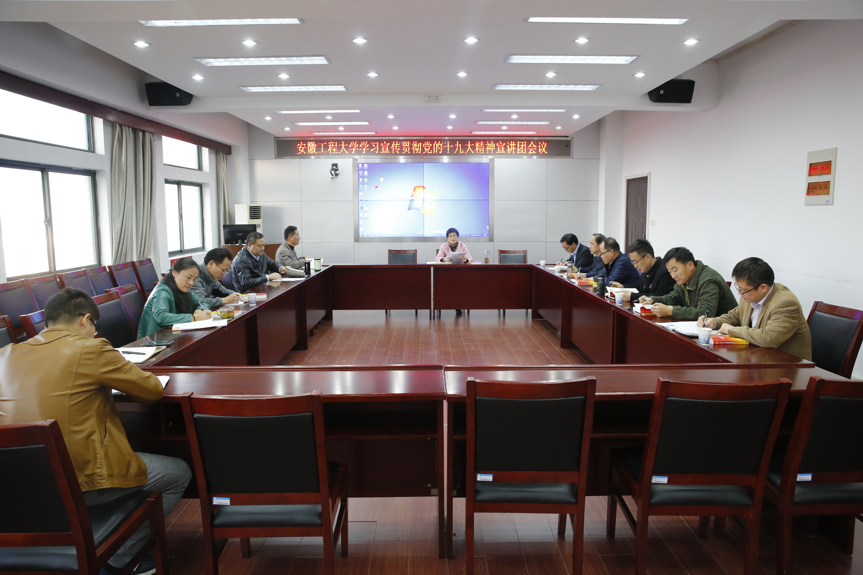 会议通报了《中共安徽工程大学委员会关于成立党的十九大精神宣讲团的通知》;校党委宣传部副部长吴月红领学了中共中央政治局常委、中央书记处书记王沪宁在学习宣传贯彻党的十九大精神中央宣讲团动员会上的讲话精神,通报了相关学习材料;校党委宣传部部长孙浩然就成立党的十九大精神宣讲团的相关工作作了具体说明,提出了具体要求。