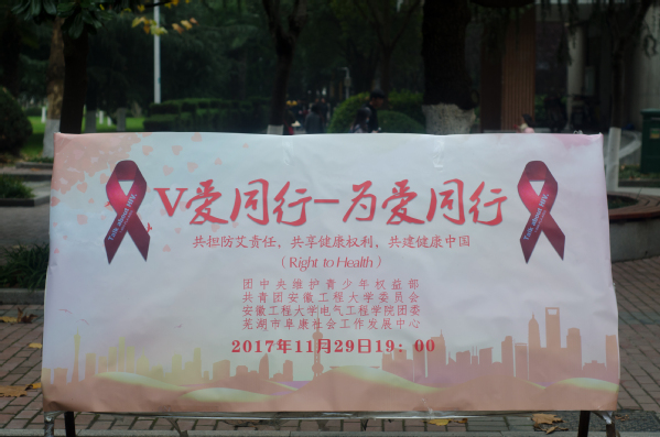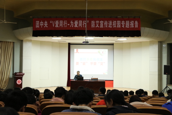 为向广大同学普及艾滋病预防基本知识,进一步提升在校大学生艾滋病预防能力,增强自我保护意识,在第三十个世界艾滋病日来临之际,2017年团中央“V爱同行-为爱同行”防艾宣传进校园活动走进我校。