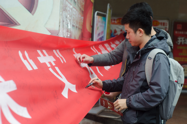 11月29日中午,电气工程学院团委组织志愿者在一食堂和三食堂门口开展了“拒绝艾滋病从我做起”的签名活动,广大同学在由标语征集大赛中获得一等奖作品制作而成的横幅上签名,以实际行动投身于防艾宣传。