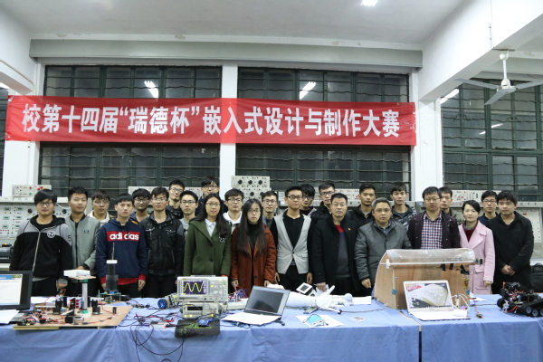 为营造良好的校园科技创新氛围,培养大学生的创新实践能力,提高大学生针对实际问题进行电子设计制作的能力,给全校电子设计爱好者提供一个展示自己的舞台,11月29日下午,由校团委主办、电气工程学院承办的校第十四届“瑞德杯”嵌入式设计与制作大赛在电气实验楼一楼举办。比赛邀请了教务处副处长张春,研究生部副部长、副主任王海,机械学院教师杨春来担任评委。电气工程学院党委书记杨会成、校团委副书记郭广春、创新学院副院长王冠凌等老师来到比赛现场。