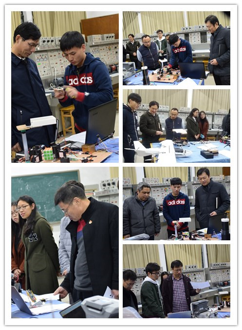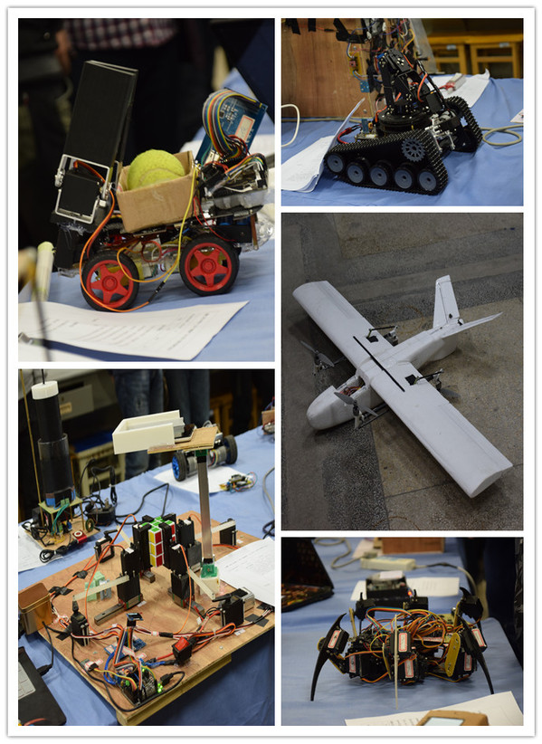 本次大赛共有25名参赛选手携电子设计作品进行展示。参赛的设计作品创意新颖、形式多样,充满了奇思妙想。既有贴近生活、接地气的“仿生机械手臂”、“智能电子秤”、“智能自主点餐器”、“空中无线手势鼠标”、“智能捡球器”等设计作品,也有高大上的 “倾转旋翼式固定翼无人机”、“六足仿生机器人”、“三阶魔方机器人”等,这些设计作品充分展现了我校大学生良好的创新思维和创造能力,得到了评委们的一致好评。