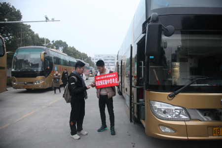 六点半,天还没有大亮,送考的校自律监察委员会学生干部和菁英班第二、三期学员代表已来到送考现场,配合保卫处工作人员和学生协管员的指引,引导数十辆大巴有序地停放在校园道路两侧。当时间接近七点时,考生逐渐到达乘车点,根据指示牌的信息乘上对应考点的大巴。