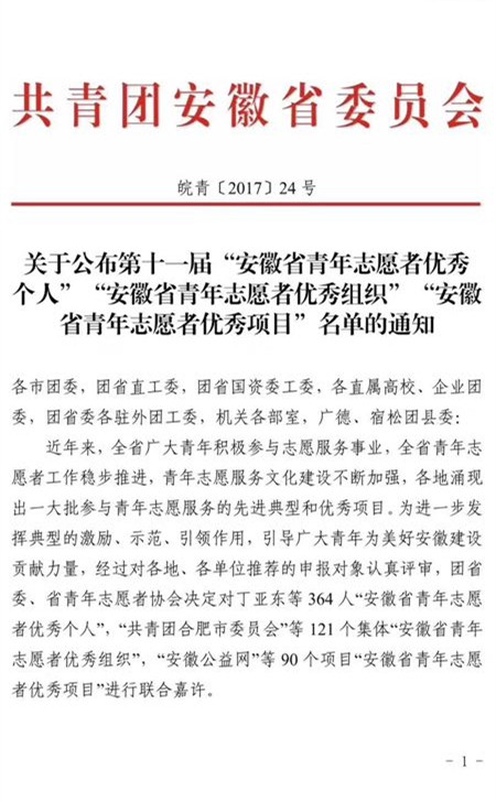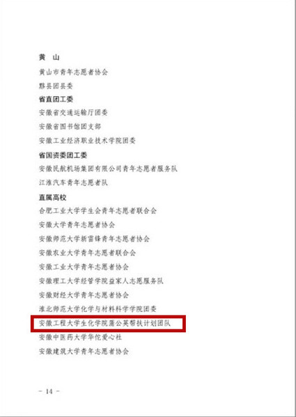 日前,共青团安徽省委对第十一届安徽省青年志愿者优秀个人、组织等进行了表彰,我校生化学院的“蒲公英”帮扶计划团队荣获“第十一届安徽省青年志愿者优秀组织”称号。