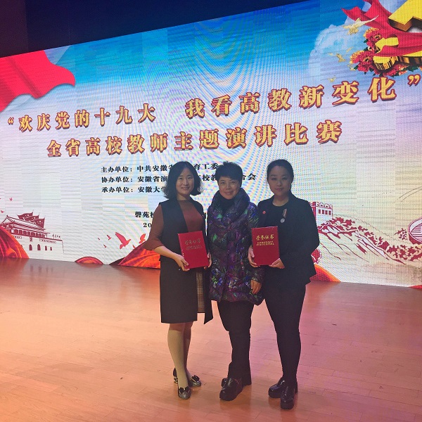 为深入学习宣传贯彻党的十九大精神,2017年12月29日,由中共安徽省委教育工委主办,安徽省演讲协会高校教师联合会协办,安徽大学承办的“欢庆党的十九大 我看高教新变化”全省高校教师主题演讲比赛决赛在安徽大学磬苑校区举办,我校教师张茜以第一名的好成绩荣获一等奖,刘畅荣获优秀奖。校工会副主席张寅红带队参赛。