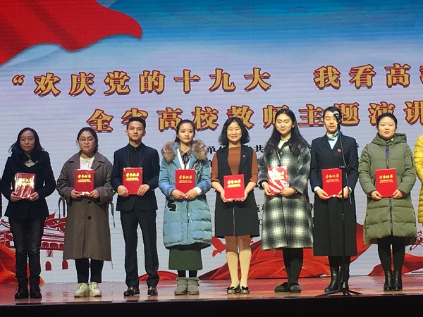 本次比赛分为校赛、预赛和决赛三个阶段。在开展校内选拔赛的基础上,各高校推荐1-2名选手参加全省预赛,预赛采用网络视频评审,根据评审结果推选30名选手参加最终决赛。我校党委宣传部会同教师工作部、校工会根据省教育工委要求在2017年11月中旬举行了校内选拔赛,选拔了2名优胜者代表学校参加全省网络视频预赛,并在全省推荐的共100多个网络视频中脱颖而出,双双闯入决赛。在决赛中,我校人文学院青年教师张茜以“不忘初心,我的十年”为题,讲述她难忘十年初心,跨越千山万水,重回母校的怀抱,努力为实现大国复兴尽绵薄之力。我校学生处青年教师刘畅以“青青菁英,灼灼其秋”为题,以点带面,通过阐述“菁英班”在学风建设和立德树人方面的示范引领作用,表明我校创新人才培养和学风建设不断取得新成效。张茜的演讲联系实际,扣题准确,声情并茂,极富感染力,表达出她对党的热爱和对理想的追求,打动了在场的所有评委和观众,最终以第一名的好成绩荣获一等奖。刘畅也表现出色,荣获优秀奖。