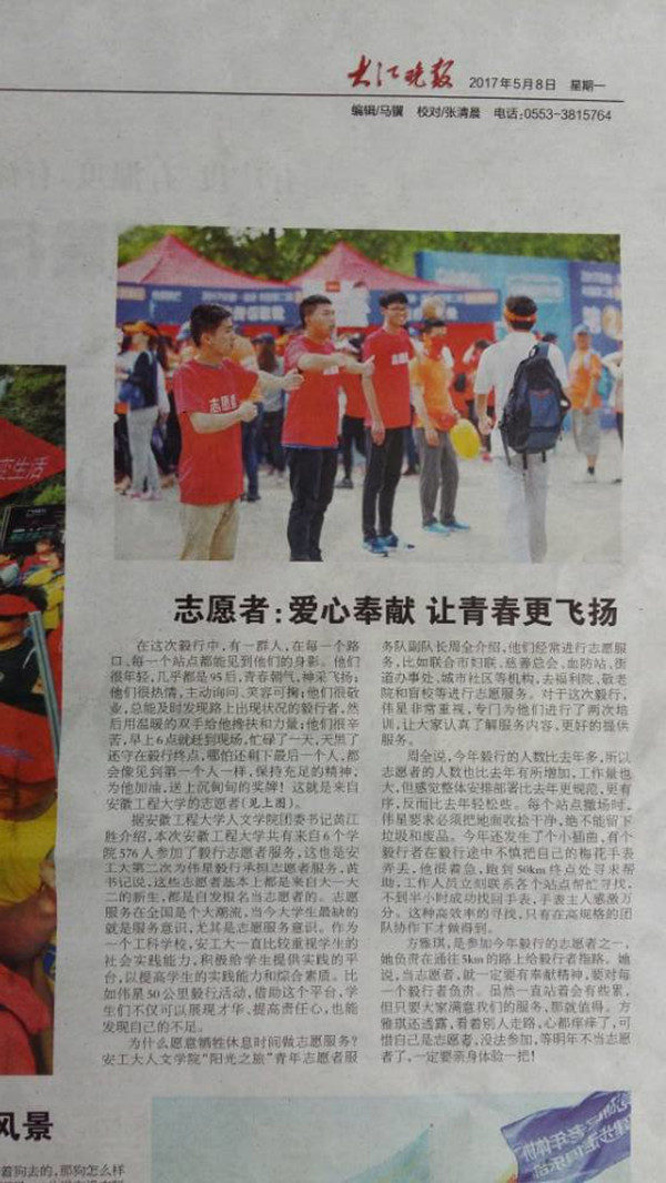 2017年5月6日,芜湖市第二届50km伟星毅行活动正式拉开帷幕,人文学院“阳光之旅”志愿队积极响应,为本次活动提供志愿服务。活动过程中,志愿者们青春朝气,神采飞扬,热情真挚,为毅行者们一路护航。参赛的毅行者纷纷竖起大拇指为他们点赞。“小黄人”们的优质服务也获得了大江晚报的实时关注,在校园内和社会上都产生了的广泛的影响。