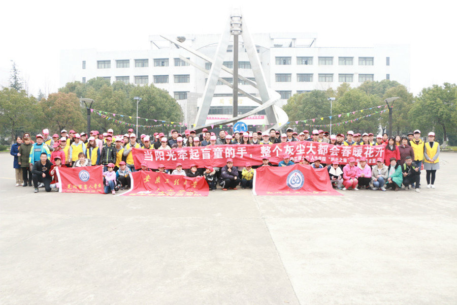 2017年3月31日,“阳光之旅”青年志愿队积极响应学校“团百花”大赛,开展了“山樱花——盲校志愿行”项目。志愿者们采取真情结对、电台暖音、体育活动、才艺交流等方式开展工作,旨在用声音在一定程度上为盲童弥补视觉上的缺失,深入与盲童展开交流,走进其内心世界,促进其融入社会。此次活动在安徽青年报的关注报道下,呼吁了更多社会各界人士用实际行动去帮助盲童,更为有效的传承了志愿者助人为乐的宗旨,传递了爱的火炬,让这个世界多了一份感恩。