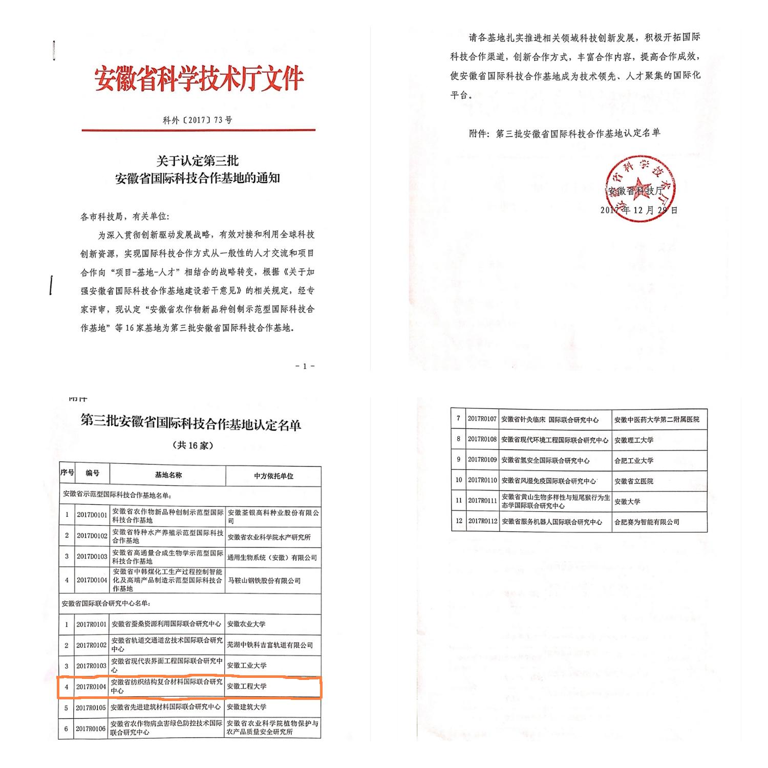 近日,安徽省科技厅下达了《关于认定第三批安徽省国际科技合作基地的通知》,认定全省16家基地为第三批安徽省国际科技合作基地。我校纺织服装学院申报的“安徽省纺织结构复合材料国际合作研究中心”喜获立项,这也是我校获批的首个国际合作科研平台。