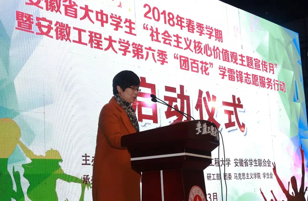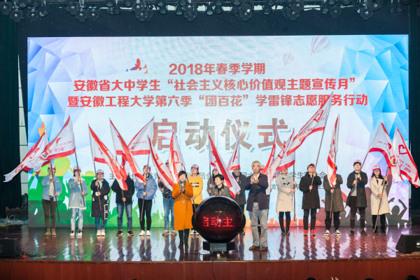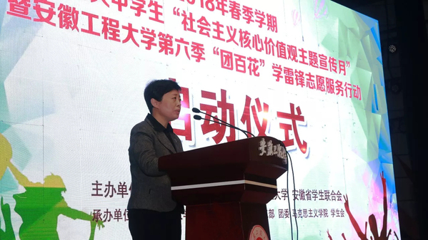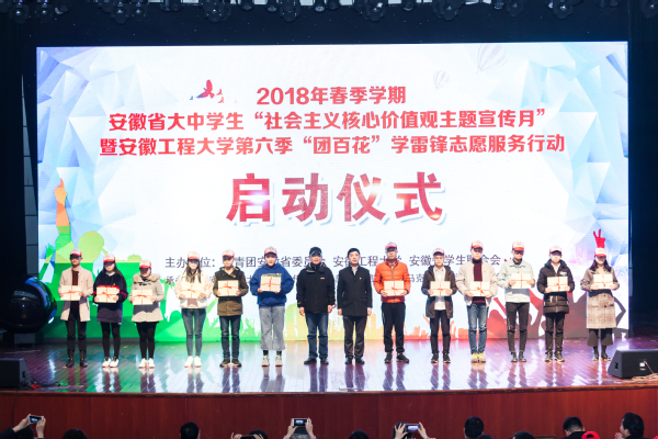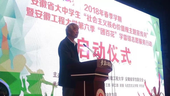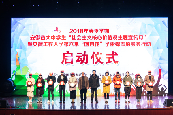 3月4日,由安徽团省委、安徽工程大学、安徽省学联主办的2018年春季学期安徽省大中学生“社会主义核心价值观主题宣传月”暨安徽工程大学第六季“团百花”学雷锋志愿服务行动启动仪式在我校举行。安徽工程大学党委书记陈其工、团省委副书记张敏、安徽工程大学党委副书记苏国红,校党委、团省委有关部门负责人,兄弟高校团委负责人等出席仪式。仪式由团省委学校部副部长马志华主持。