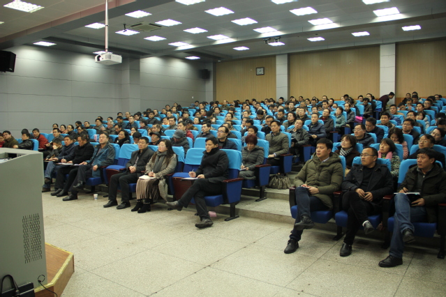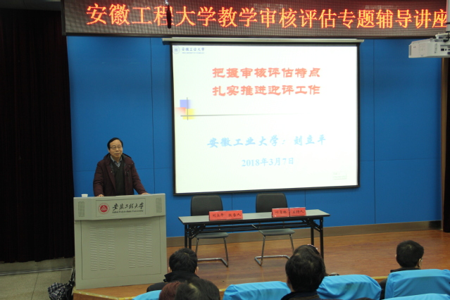 3月7日下午,安徽工业大学教师能力发展中心(教学质量监控与评价中心)主任刘立平教授应邀来我校作《把握审核评估特点 扎实推进迎评工作》的本科教学工作审核评估专题辅导报告。学校全体处级干部,各学院教学秘书、系负责人、专业负责人、教研室主任、实验中心主任、部分骨干教师,校院两级教学督导成员,教务处及校评建办全体人员参加了报告会。报告由副校长叶常林主持。