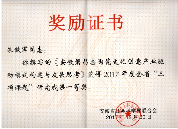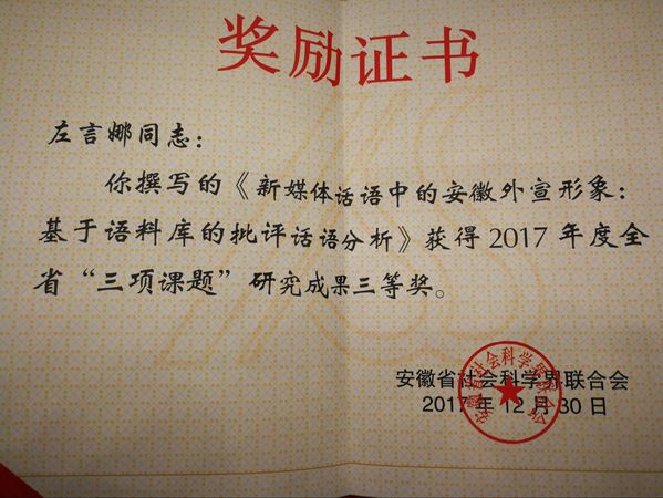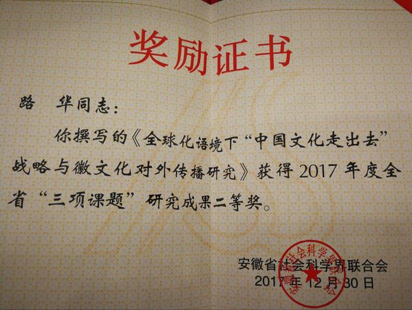 近日,安徽省社会科学界联合会发布《关于奖励2017年度“三项课题”研究优秀成果和先进单位的决定》:我校教师朱铁军撰写的《安徽繁昌窑陶瓷文化创意产业驱动模式构建与发展思考》获高校社科联研究成果一等奖;路华撰写的《全球化语境下“中国文化走出去”战略与徽文化对外传播研究》获省属社科类社会组织研究成果二等奖;左言娜撰写的《新媒体话语中的安徽外宣形象:基于语料库的批评话语分析》获省属社科类社会组织研究成果三等奖。
