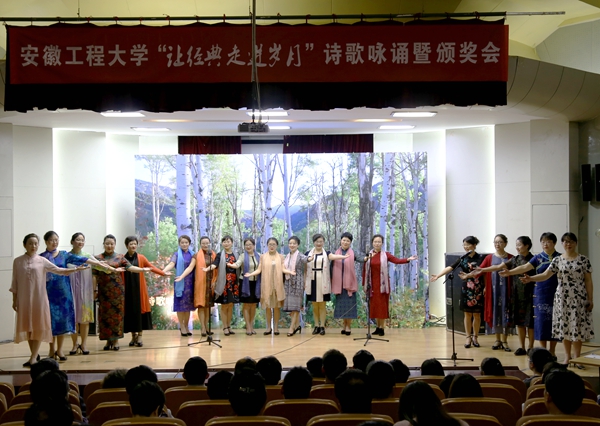 经典入岁月,岁月伴经典。4月18日下午,由校工会、校党委宣传部、校团委共同主办,校工会女工委承办的“让经典走进岁月”诗歌咏诵暨颁奖会在学术报告厅举行。安徽省教科文卫体工会调研员、女工委主任王兰,校党委副书记苏国红,副校长郭兴众,校纪委书记王红月,校老领导、关工委常务副主任肖学东,以及主办部门负责人、各二级党组织负责同志、工会专兼职干部、退休老同志和老师学生代表共同参加了本次活动。活动由校工会女工委主任张寅红和安徽省文明家庭、外国语学院朱琦老师主持。