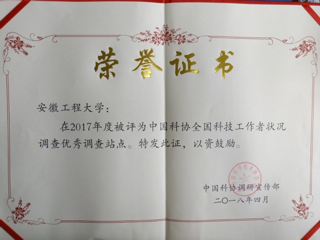 4月16日至19日,全国科技工作者状况调查站点培训会在四川成都召开,中国科协隆重表彰2017年度全国科技工作者状况调查优秀调查站点和优秀区域责任部门,我校获评“2017年度全国科技工作者状况调查优秀调查站点”称号。