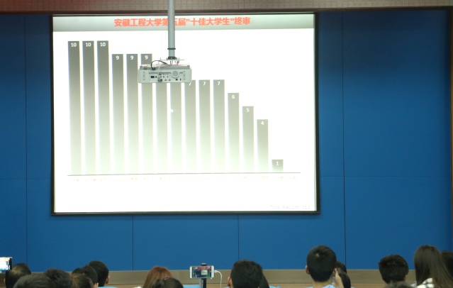 进入终审的16位同学依次作PPT汇报,涵盖道德示范、科技创新、自立自强、志愿服务、创新创业、社会工作、对外交流、文艺创作、体育锻炼等类别。同学们或讲述退伍不褪色,以满腔热血与责任担当护我国土,守我海疆;或讲述在创新之路上用一摞摞证书、一沓沓专利诠释助力“中国制造”的梦想;或讲述在国际赛事舞台上,看到“安徽工程大学”和自己名字共同出现在荧屏时的那一幕感动;或讲述成长路上无畏家庭的困境,一次次刷新学习成绩的坚持与自强;或讲述为了心中的梦想,深入千里之外的大凉山义务支教的经历与感悟;或讲述创业路上的跌跌撞撞,在摸爬滚打中找到成功的路;或讲述身在海外却心系祖国,在异国他乡求学,充分展现中国自信和力量…… 同学们的先进事迹,给评委和观众带来一次次的震撼和深深的感动,现场不时响起持久的掌声。在校团委微信公众号上,网名为“穆志强”的同学留言评论:“一个小萌新在现场瑟瑟发抖,可以说是超厉害了,按摞晒证书。”网名为“pbcwshjtdxyjs”同学留言评论:“终其一生,我可能也无法复制宇哥的成就,但我知道,每个人的人生都该是五彩斑斓的,既然我们无法复制别人成就,那就做好自己,以宇哥为榜样,做到更好!”。蒋文玉同学在微信朋友圈里写到:“看了十佳大学生(终审),感触实在是大!……太多太多优秀的事例让人感动、奋进!”